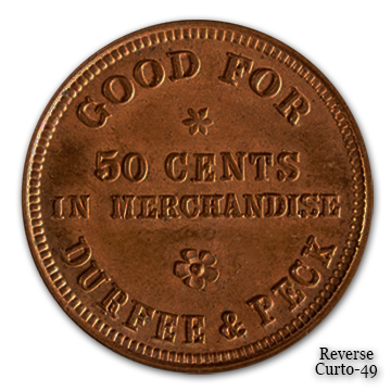 The Durfee & Peck tokens were issued in 25 cent, 50 cent and $1.00 denominations. Adjusting for inflation, the 25 cents of 1868 would be worth about $4.48 in today’s goods. Multiply that by two and four and you have the other two tokens adjusted worth in goods.
