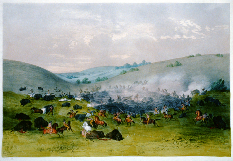 The buffalo are killed mostly with arrows, as they are not only less expensive, but can be withdrawn and used again. These animals are generally hunted in the following manner: A large herd is surrounded and gradually driven in together. And there is exhibited a piece of strategy thoroughly Indian. The stragglers on the outside of the main herd are shot in the liver and will bleed to death internally in going four or five miles. The hunters will keep on driving them, and the carcasses at the close of the chase are not scattered over so large an extent of ground as they would be if the stragglers were shot dead. When the circle is well closed in, the hunters begin to shoot at the heart. Their ponies are all trained and will not enter the herd, but keep always around the outside, though the rider does not draw a rein on them after the main herd is reached.