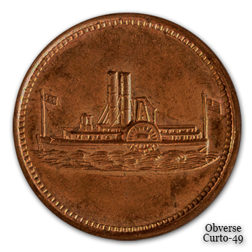 The second specimen is listed as Curto-49. Also struck in copper, it is Choice AU in grade. It possessed a face value of 50-cents.